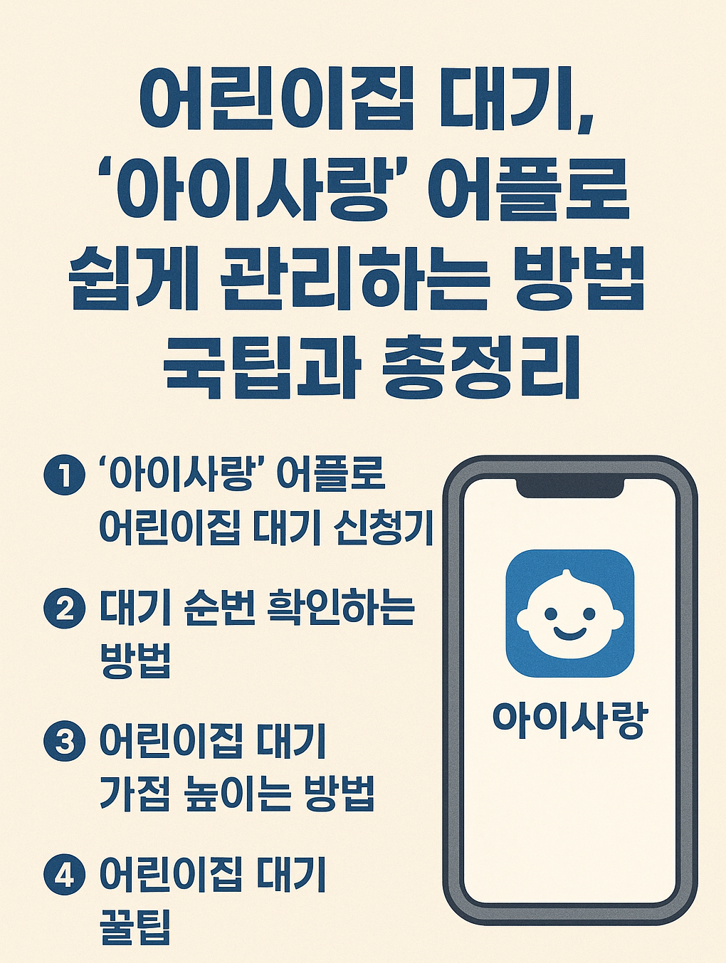 2025년 11월 3일, 아이사랑 어플을 통해서 어린이집 대기순번이 확정되었습니다. 매년 11월초에 순번이 확정되고 11월~12월초 사이에 어린이집은 순번대로 전화를 돌려 입소아이들을 확정합니다. 두근두근 우리 아이의 첫 사회생활, 바로 어린이집 입소죠. 하지만 인기 있는 어린이집은 늘 경쟁이 치열하고, 입소를 위해선 대기 등록이 필수입니다. 오늘은 ‘아이사랑’ 어플을 통해 어린이집 대기 등록부터 순번 확인, 가점 활용법까지 정리해드릴게요.
