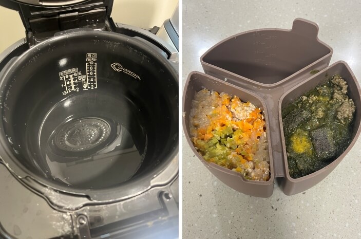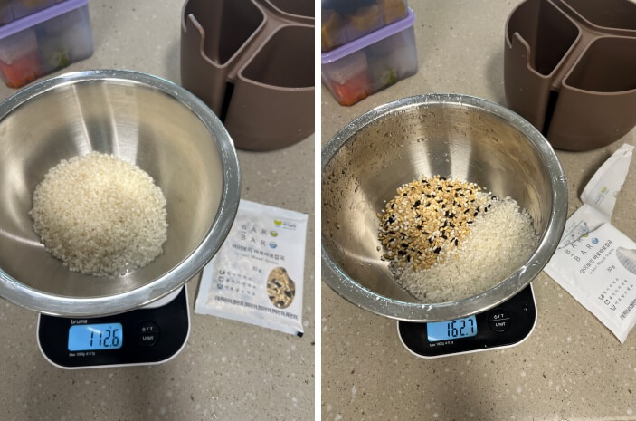 오늘도 불리기 전 쌀 110g에 아이보리에 나온 잡곡 30g을 섞어 140g을 맞춰주고 쌀을 씻은 후 무게의 절반씩 칸막이에 덜어냅니다.