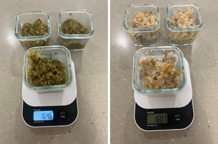 역시 160g 정도로 많이 나왔고 큐브를 줄여서 150g으로 맞출까 하였으나 아기상어가 요즘 160-170g도 잘 먹어주기 때문에 그냥 내버려 뒀습니다. 많이 잘 먹을 때 팍팍 먹여야 하니까요 ㅠㅠ (요즘 그렇게 먹으니 또 볼에 살이 올라서 기쁜 엄마입니다..)